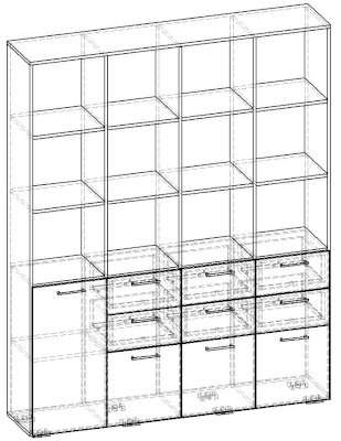 Применение задней стенки из ЛДСП (в ячейках с ящиками и фасадами) позволяет использовать данный стеллаж для зонирования пространства (чтобы предотвратить опрокидывание, необходимо обеспечить крепление стеллажа к стене).