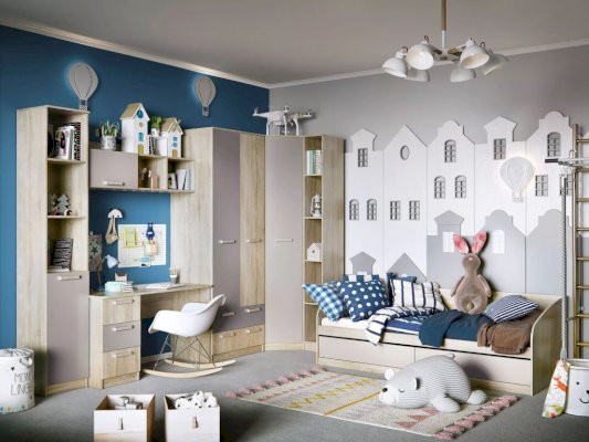 Полка органично дополнит рабочее место в детской. Закрытая секция модуля подойдет для хранения книг. Газлифты максимально высоко поднимают фасад вверх, обеспечивая большую площадь обзора содержимого. Предметы декора будут хорошо смотреться в открытых секциях полки.